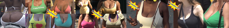 This week more Asian combo-clips showing the busty cutie on the left grabbed in two seethrough-tops, and skinny but superbly stacked Nom on the right, molested in several sexy and tight tit-tops! This week again fantastic sighting-compilations from Miami including the ballooning stunner on the right and one busty lass wearing not less than four tops in one clip! A gorgeous deep and wobbling black cleavage from London and new summer-clips from Spain, including topless torpedoes from the beach! |